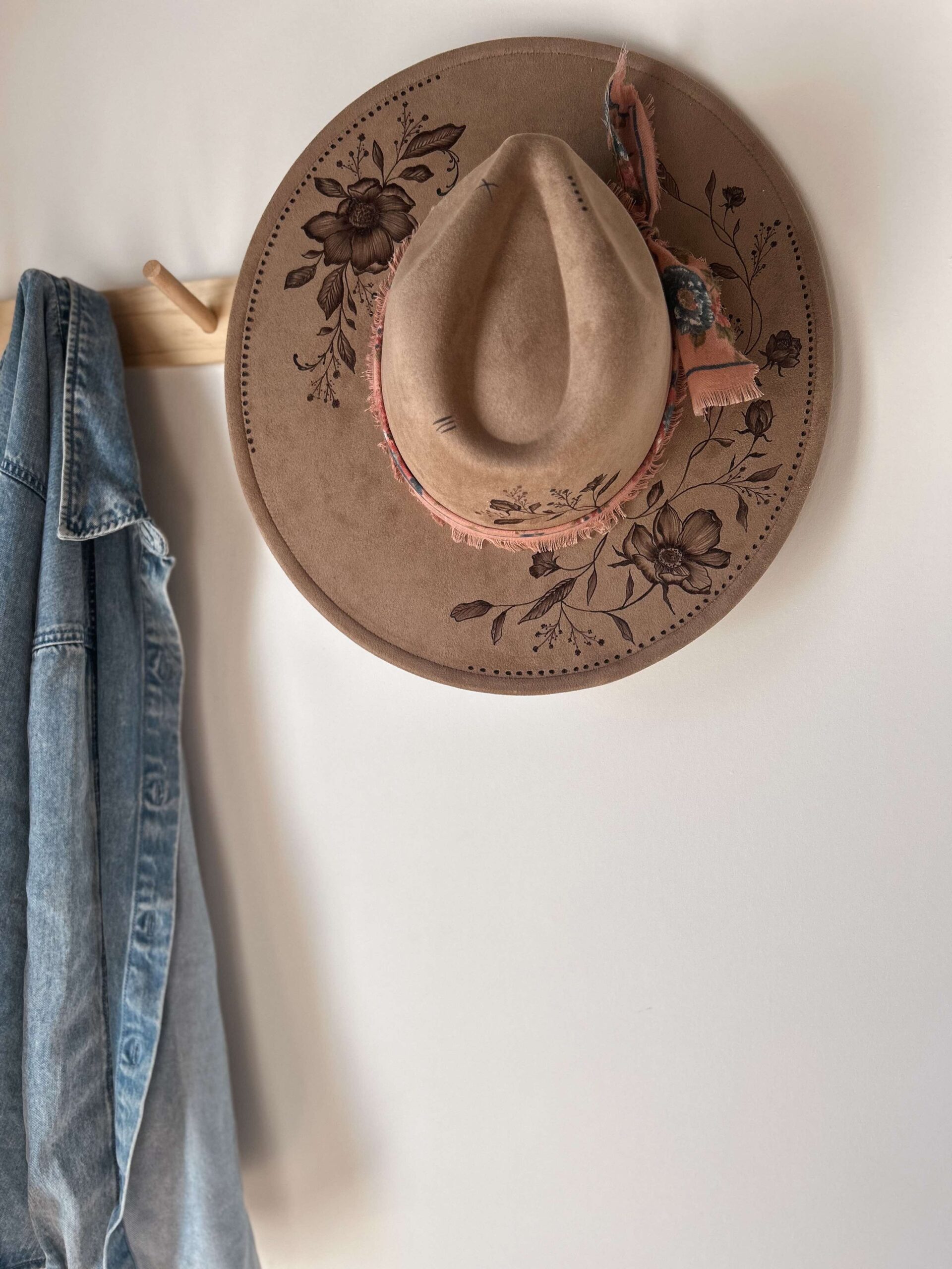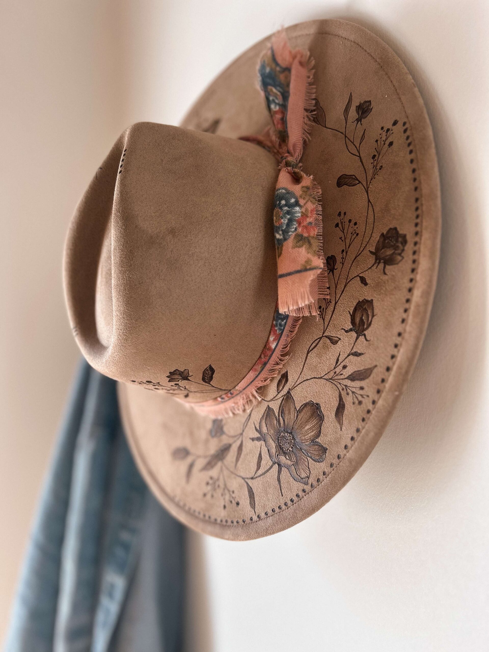 De la douceur pour appeler le printemps… voilà ce qui émane du chapeau « Blossom ». La teinte taupe du chapeau et le vieux rose du foulard ajoutent un petit quelque chose de très féminin à cette création.