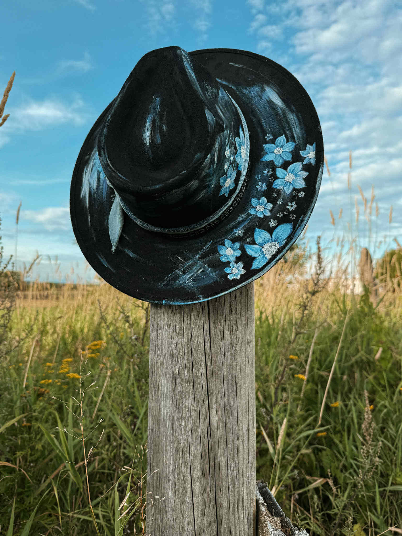 « Blue Tornado » est un chapeau peint à main levée sur un tissu de couleur noir. Ce chapeau complimente à merveille les gens aux yeux bleus en raison de la ligne de peinture située sous le chapeau. Cet accessoire élégant et artistique apportera une touche d’originalité à votre style !