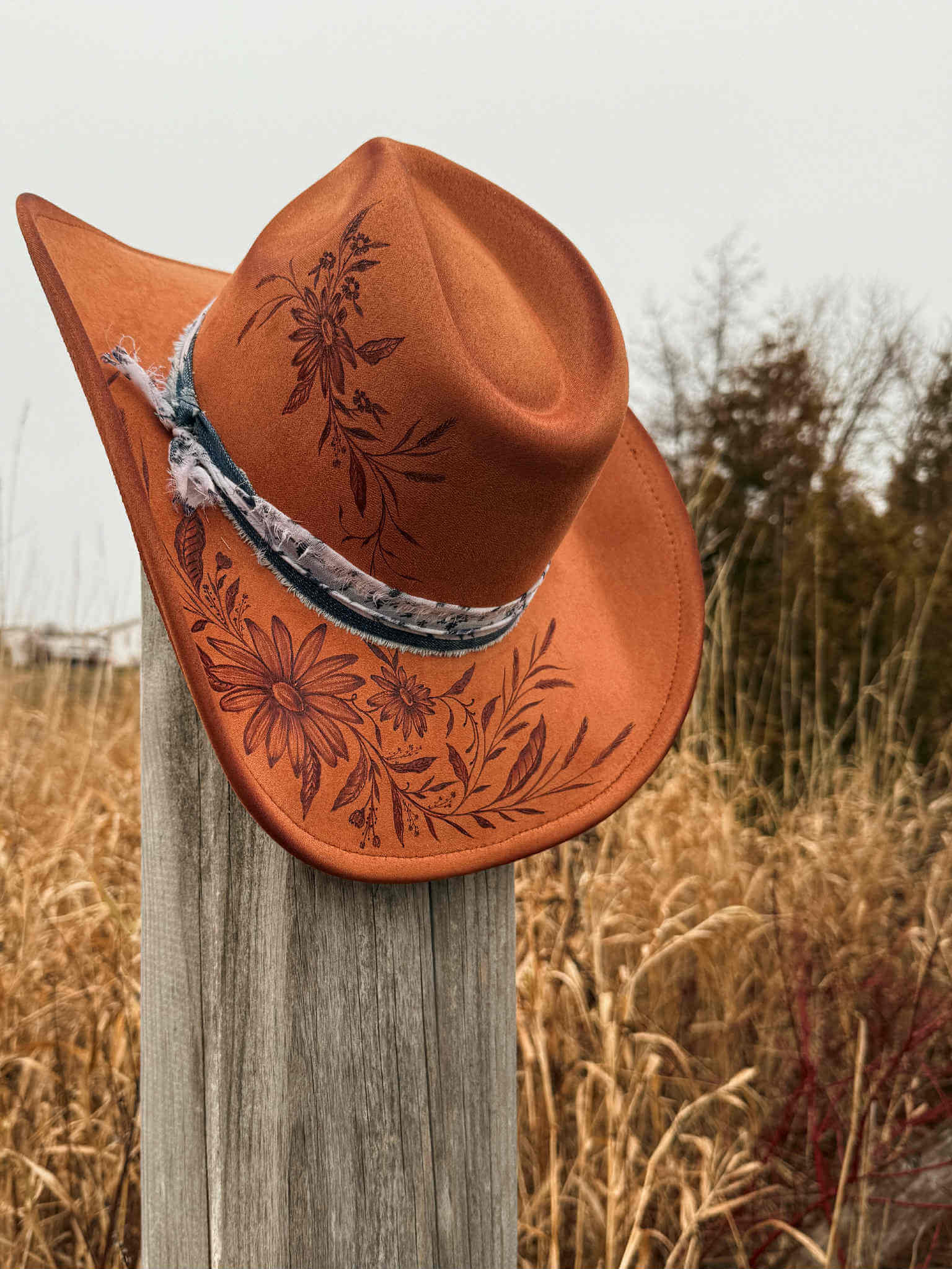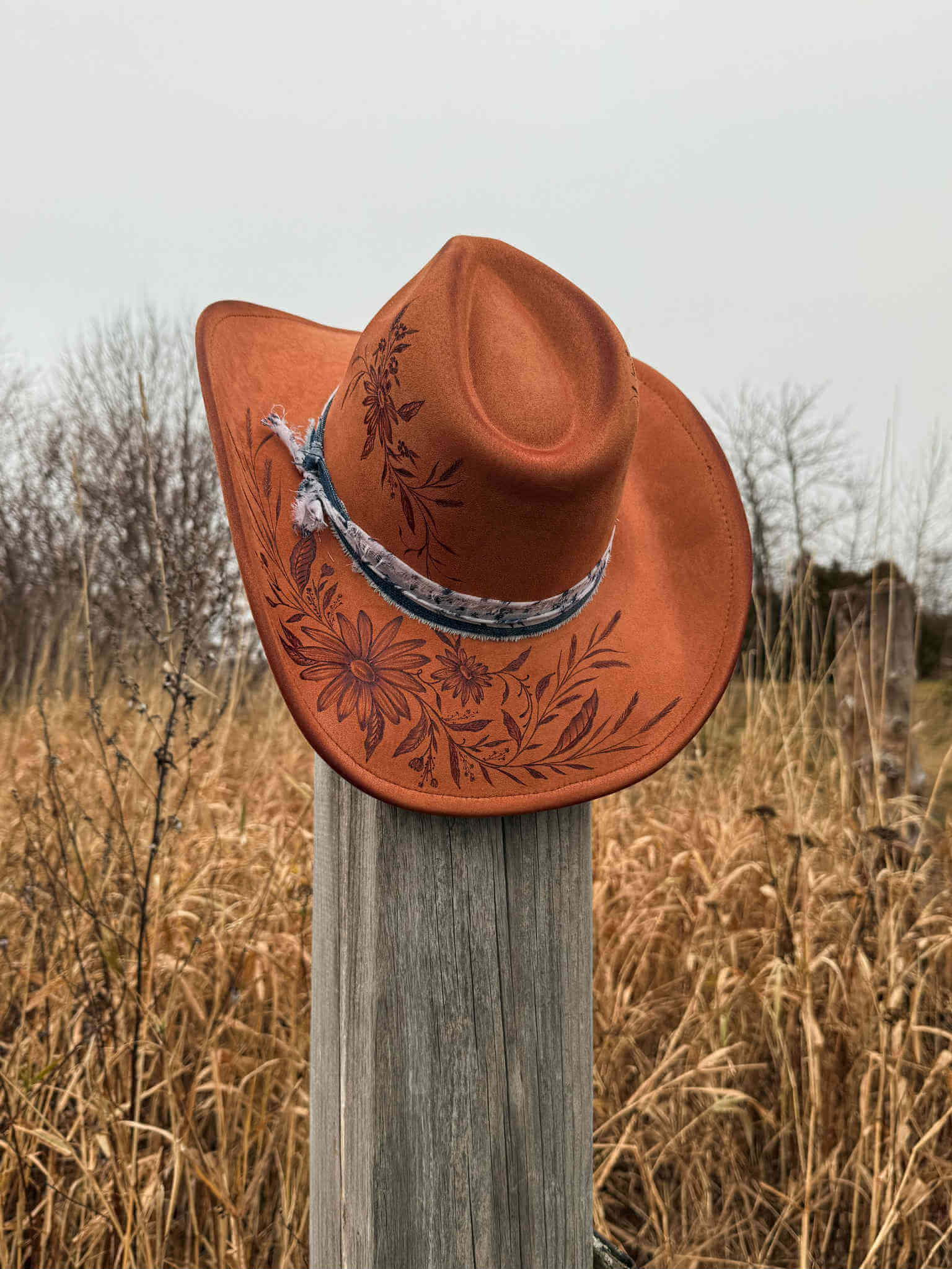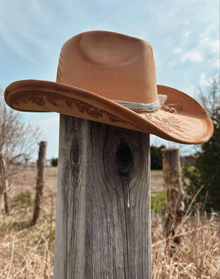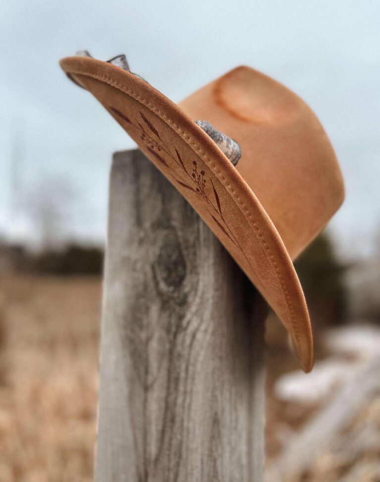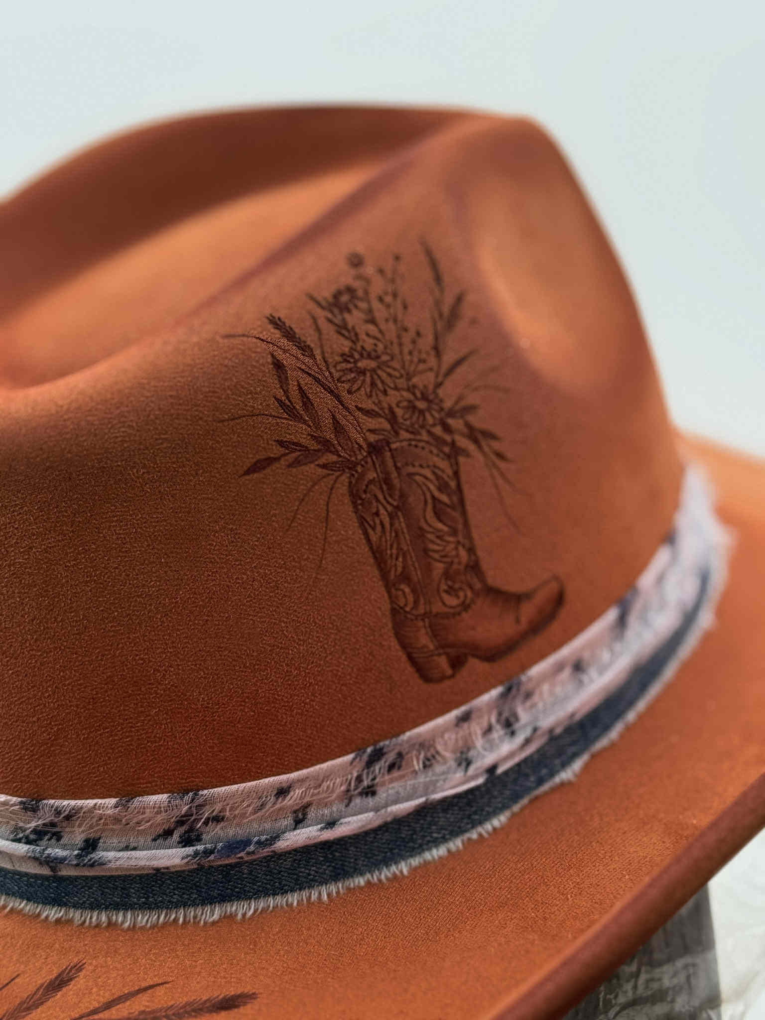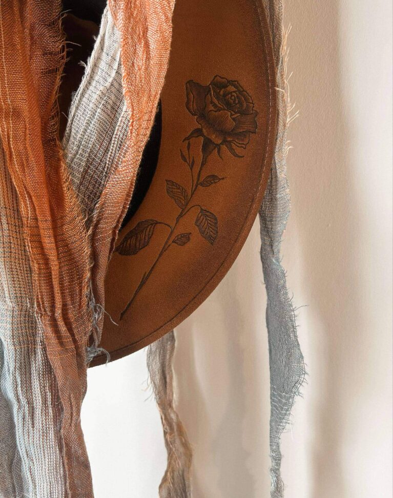 Un chapeau à la teinte rouille profonde qui rappelle le cuivre….ce qui lui donne son charme lumineux. Les marguerites délicatement pyrogravées apportent une belle douceur florale, contrastant avec l’emblématique botte de cowboy un peu plus rustique.