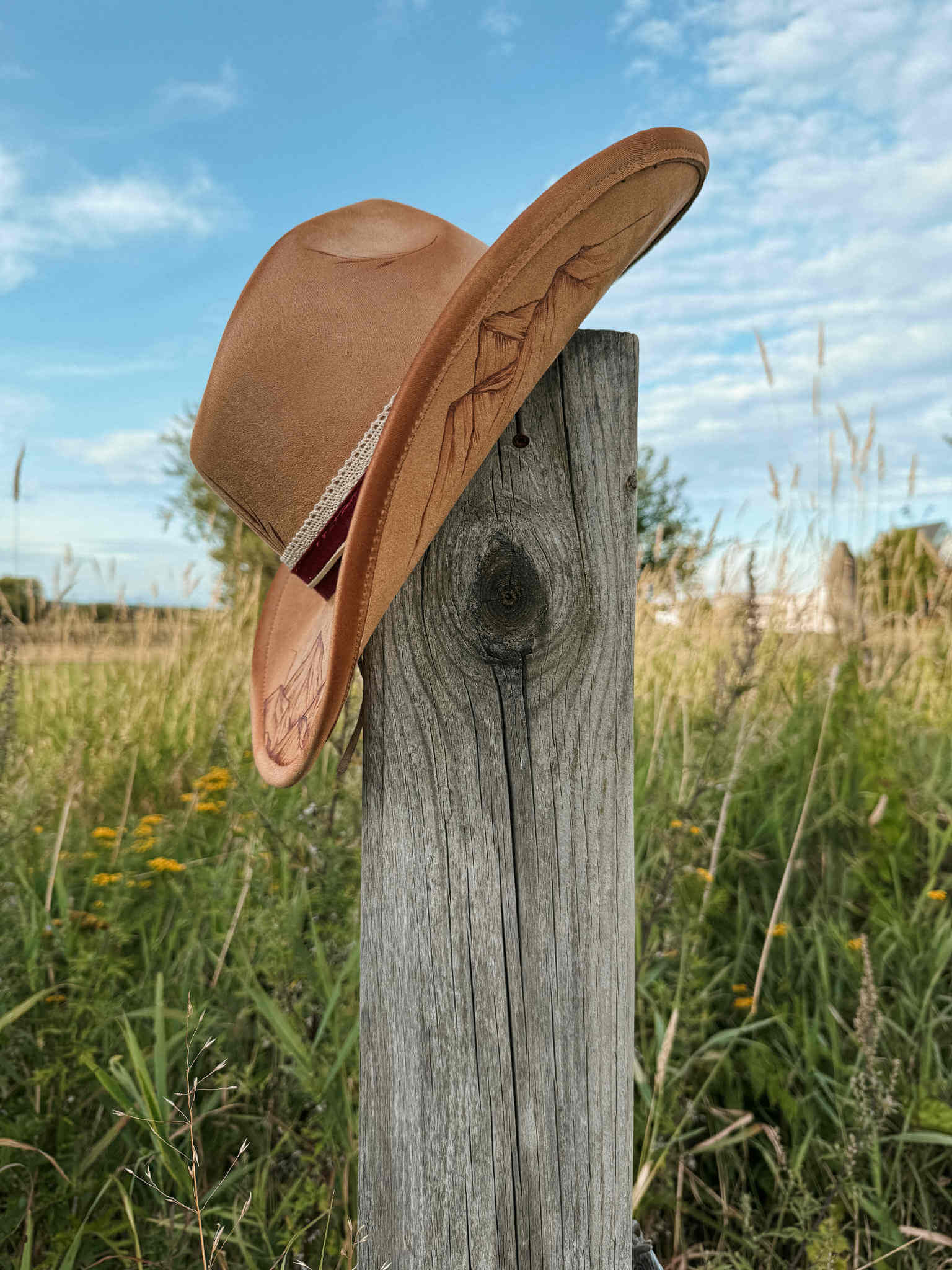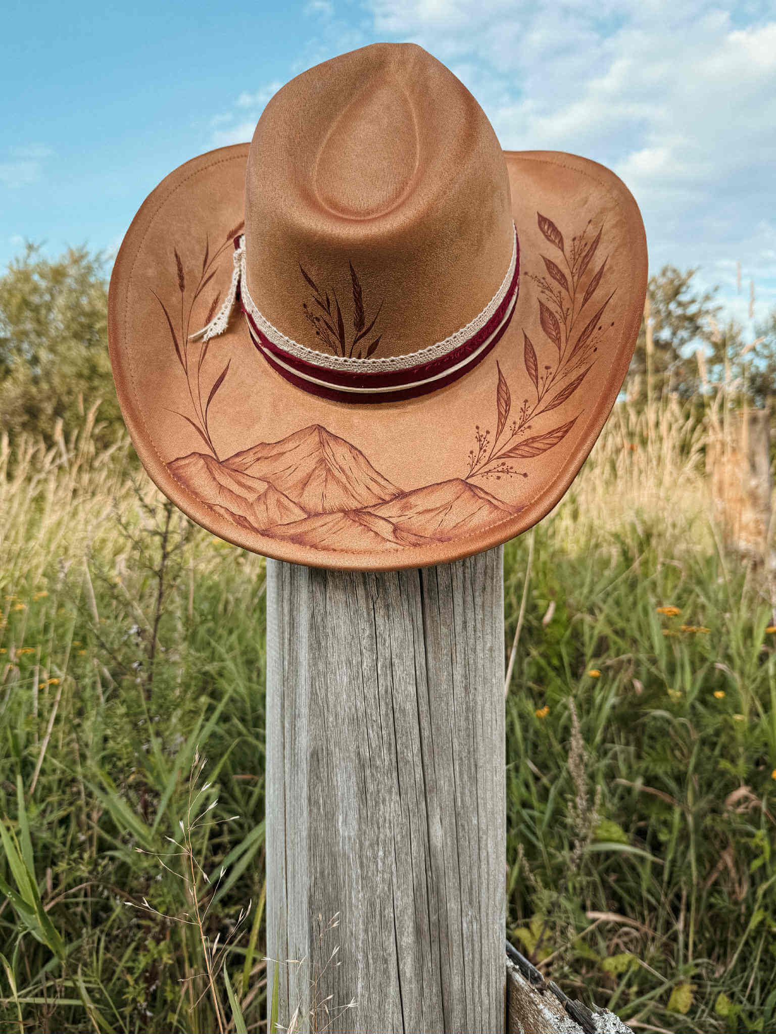 « Dusty Trails » est un chapeau unique pyrogravé à la main, orné de majestueuses montagnes et d’un contraste saisissant entre blé doré et feuillage. Un accessoire qui incarne la dualité entre force et douceur.