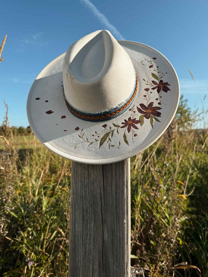 Chapeau Pyrogravé – « Fleurs d’automne »