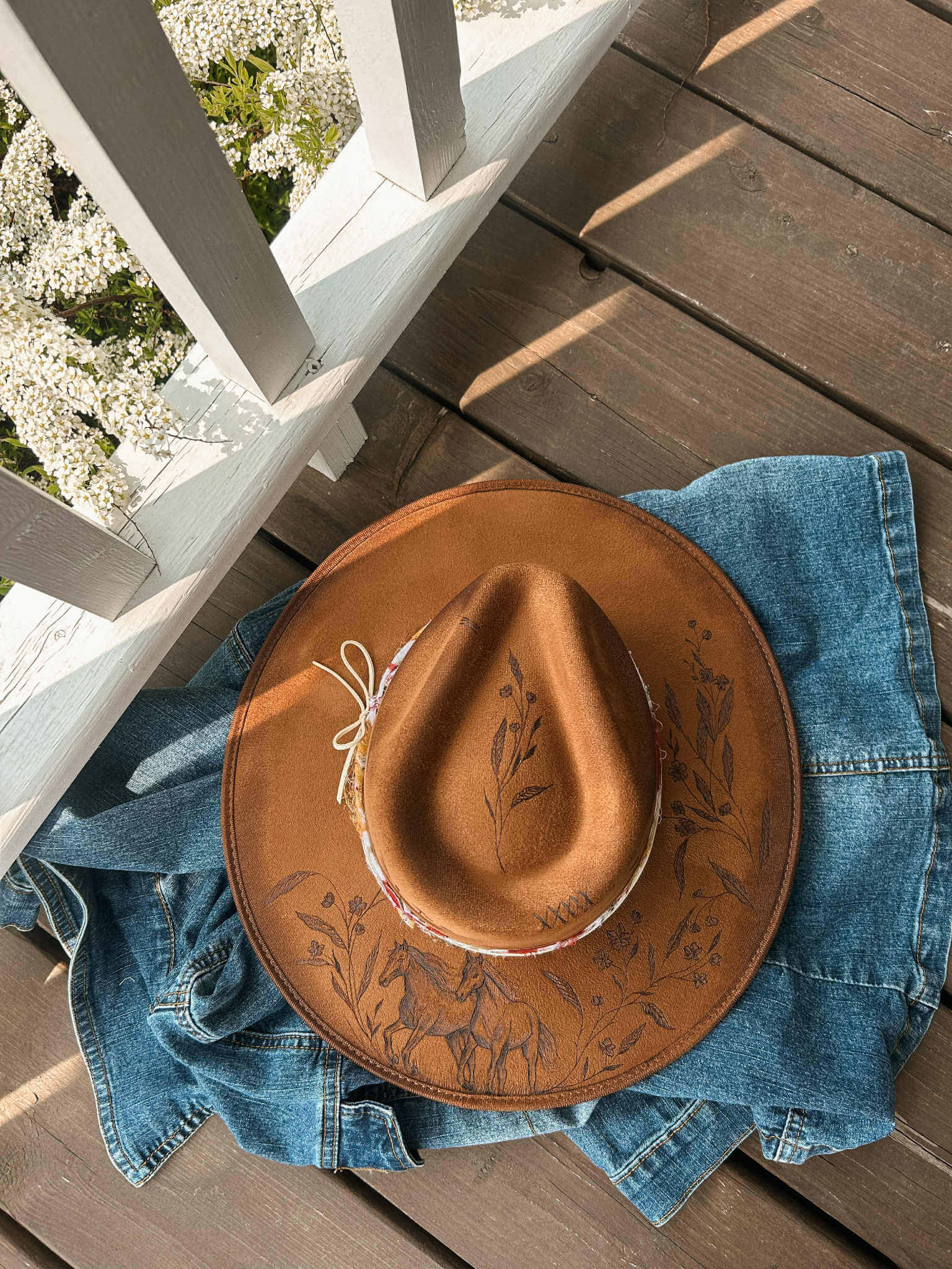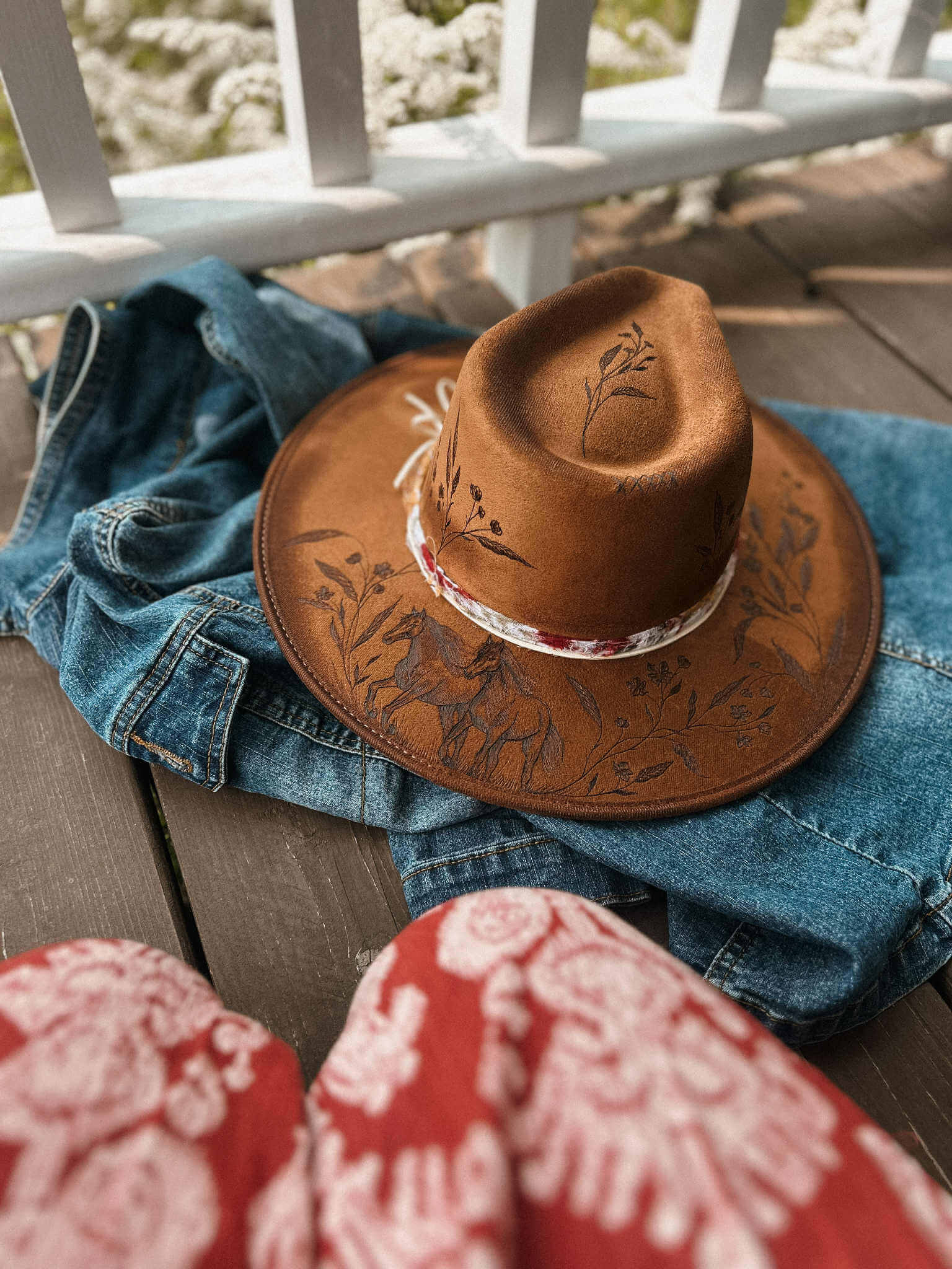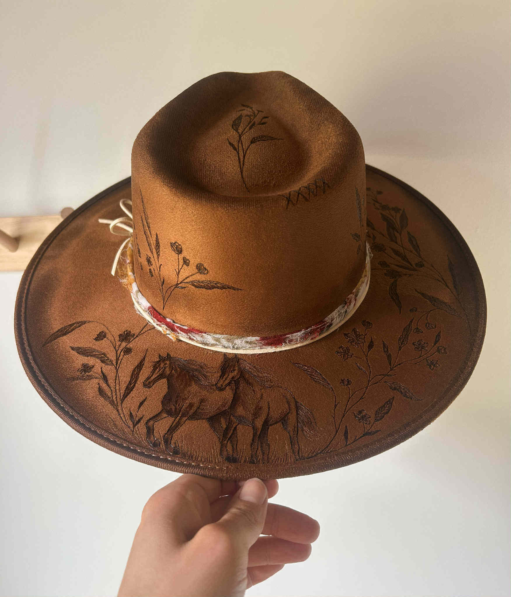 « Free Spirit » est une magnifique création pyrogravée à la main sur un chapeau de couleur « cognac ». Deux chevaux libres comme l’air entourés de délicates fleurs. Il s’agit d’un chapeau très passe-partout qui fera tourner les têtes.