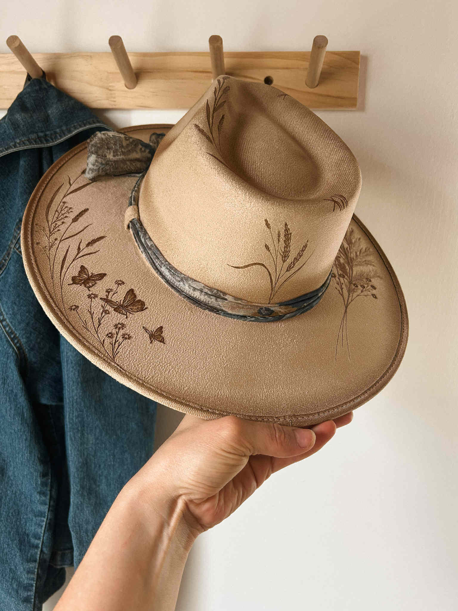 « Harvest Flight » est mon tout premier chapeau pyrogravé sur la couleur « nude » et certainement pas le dernier. La couleur de la pyrogravure mélangée au beige chaud du chapeau évoque un champ de blé au coucher de soleil. Tu es amoureuse des champs et des papillons ? Ce chapeau est assurément pour toi …