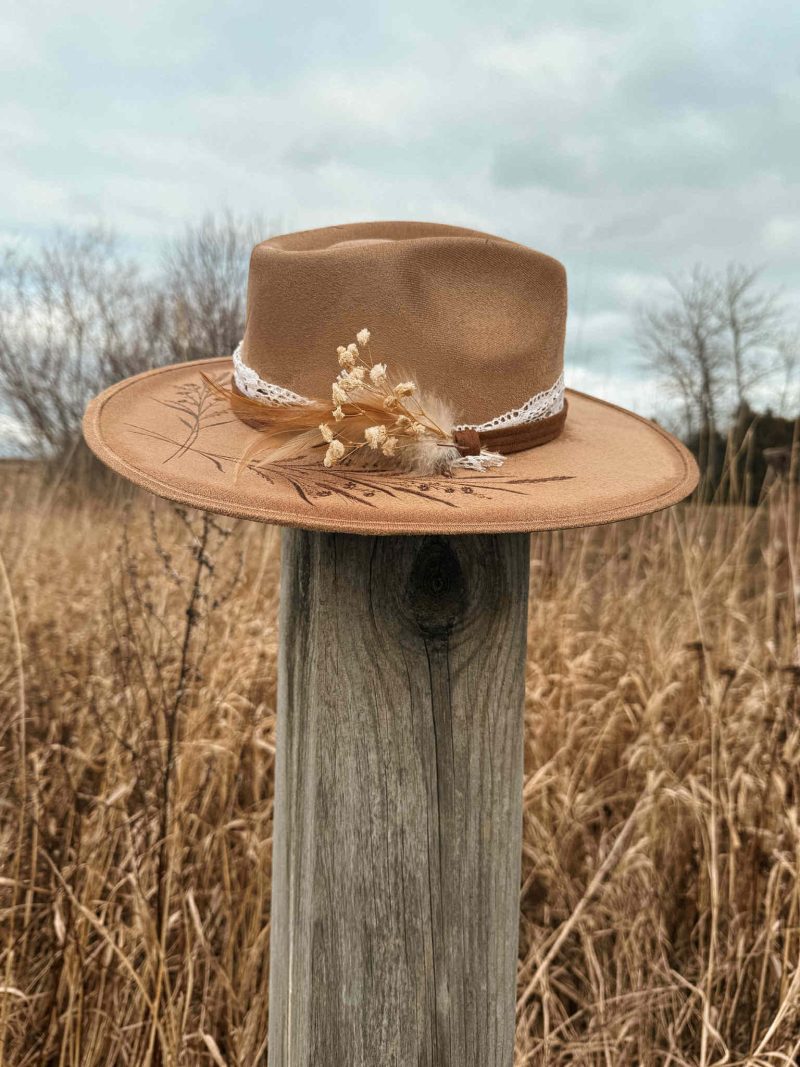 « Lace Dream » est un chapeau très universel et doux. Il s’agit d’une création alliant les fleurs séchées et le blé, deux « designs » de pyrogravure énormément aimées. Orné d’une fine dentelle et de plumes aux teintes chaudes, il s’agit d’un chapeau qui évoque les champs au vent et l’élégance.
