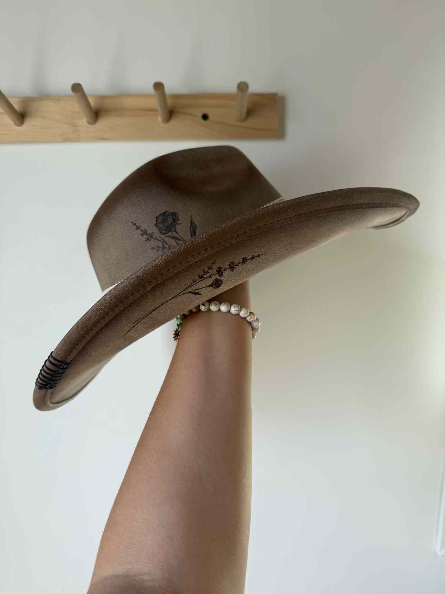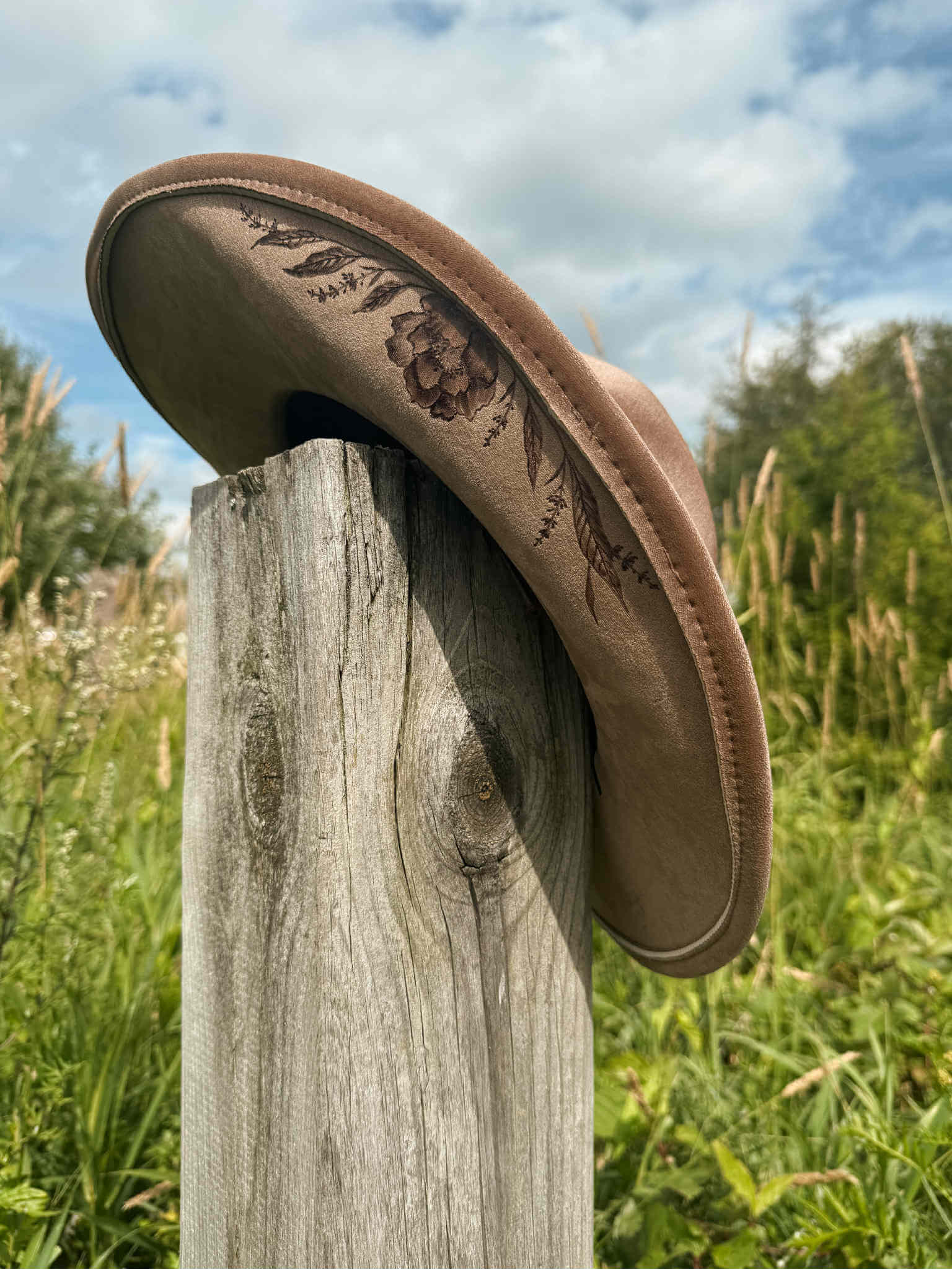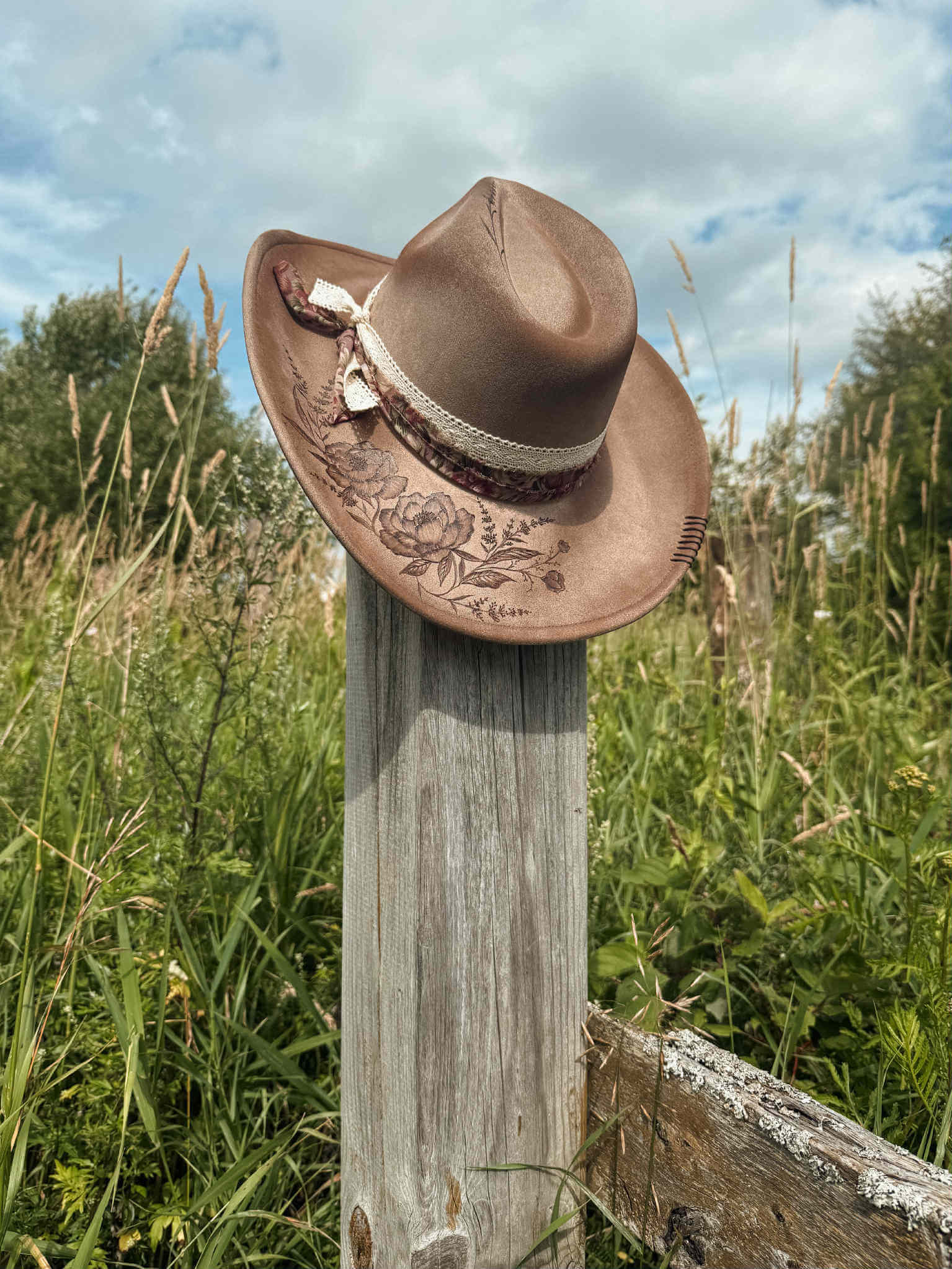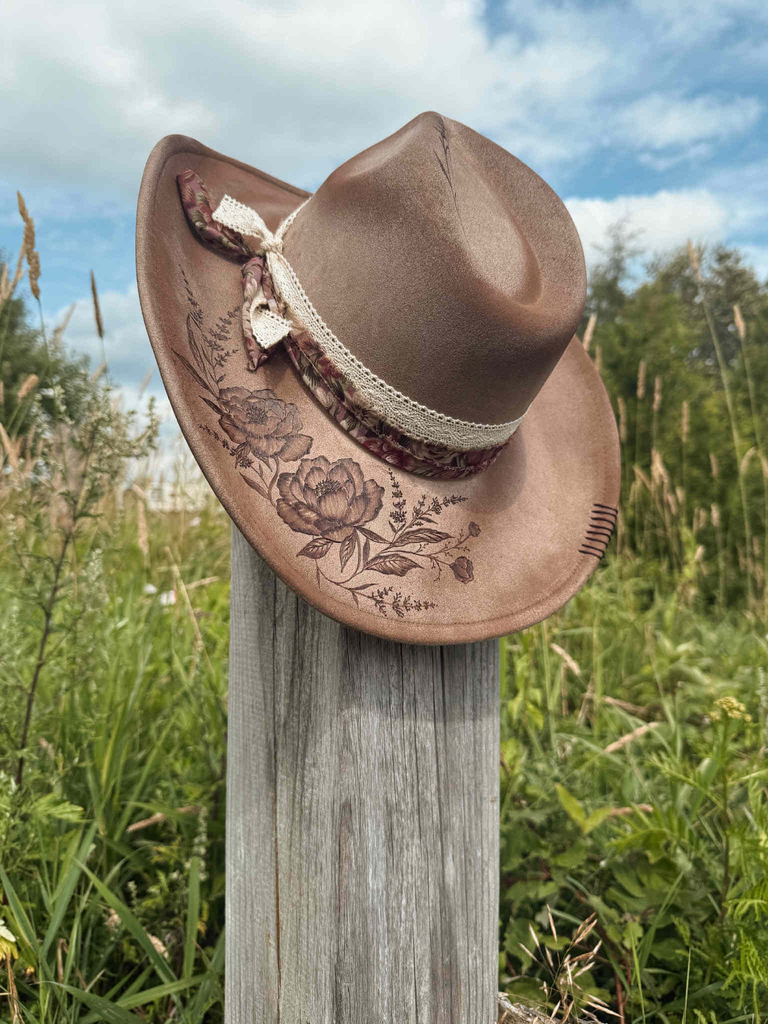 « Lavender Trail » est un chapeau de cowboy unique puisqu’il combine la pyrogravure et la peinture aérosol pour tissus. La touche brune de la peinture et le ruban orné de pivoines lui confère un look bien à lui en le rendant très « vintage ». Des belles fleurs et un peu d’effet « d’usure » pour rendre vivant ce chapeau parfait pour toi !