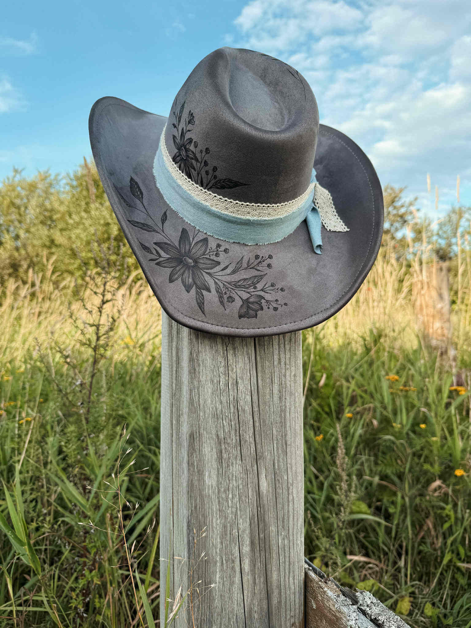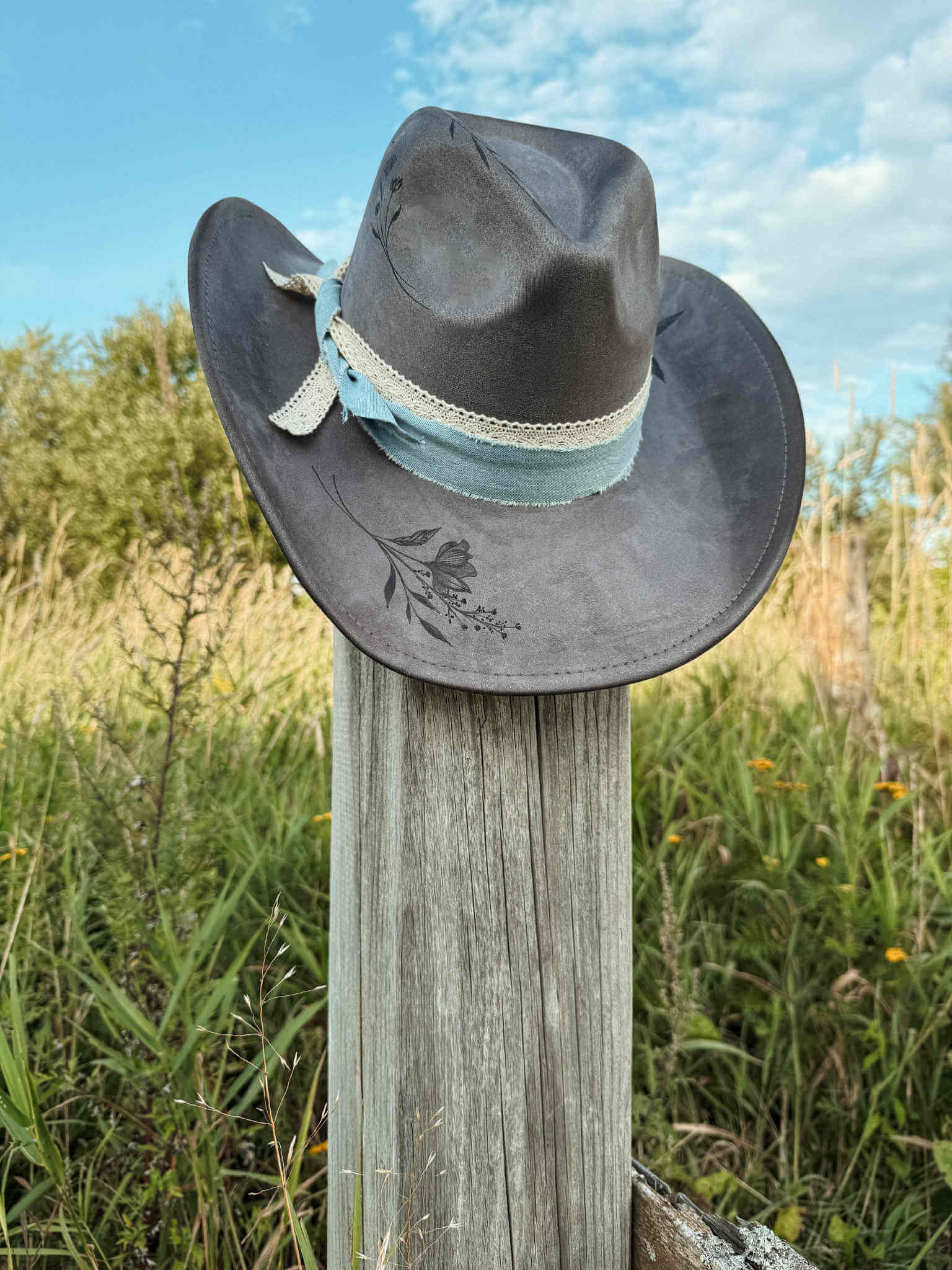 « Midnight Rodeo » est un chapeau très délicat, orné d’une bande de jeans pour un petit look rustique chic. Pyrogravé à la main de fleurs délicates et de montagnes majestueuses, c’est un mélange authentique de douceur et de caractère.
