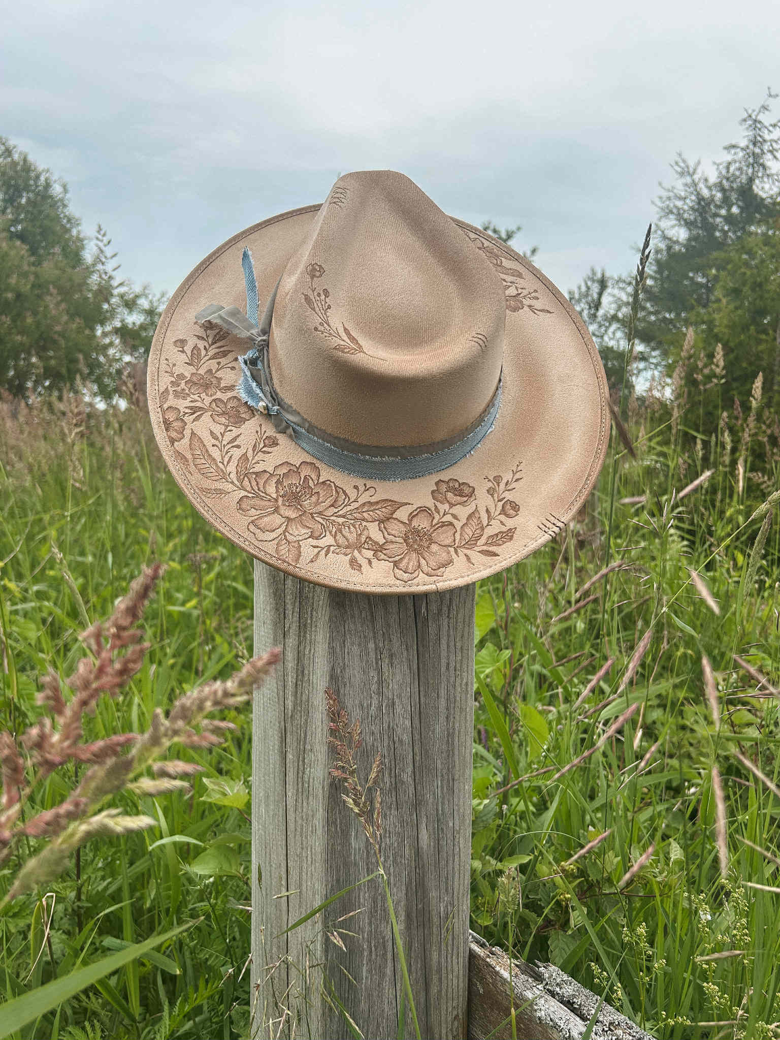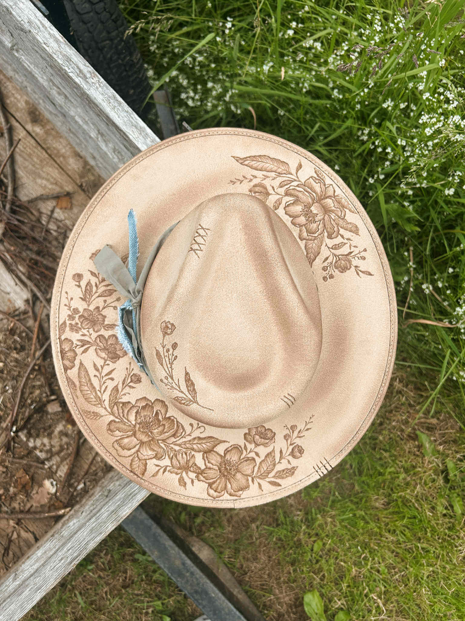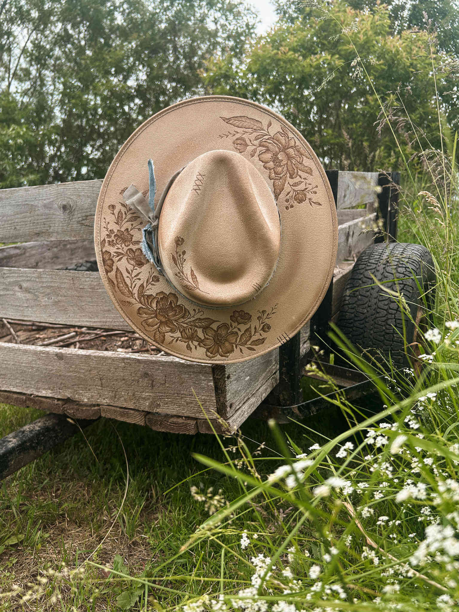 Peonies Garden est un chapeau magnifiquement orné de fleurs de pivoines. Cette création a beaucoup de détails, mais reste douce au regard grâce à l’agencement du ruban sauge et de la petite bande de denim.