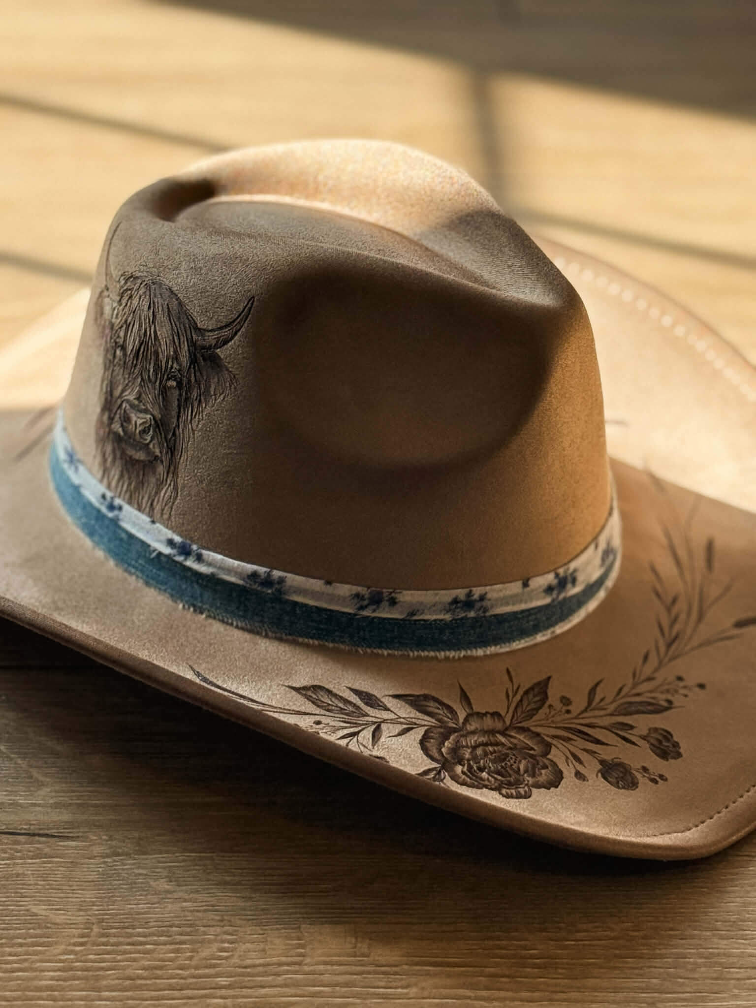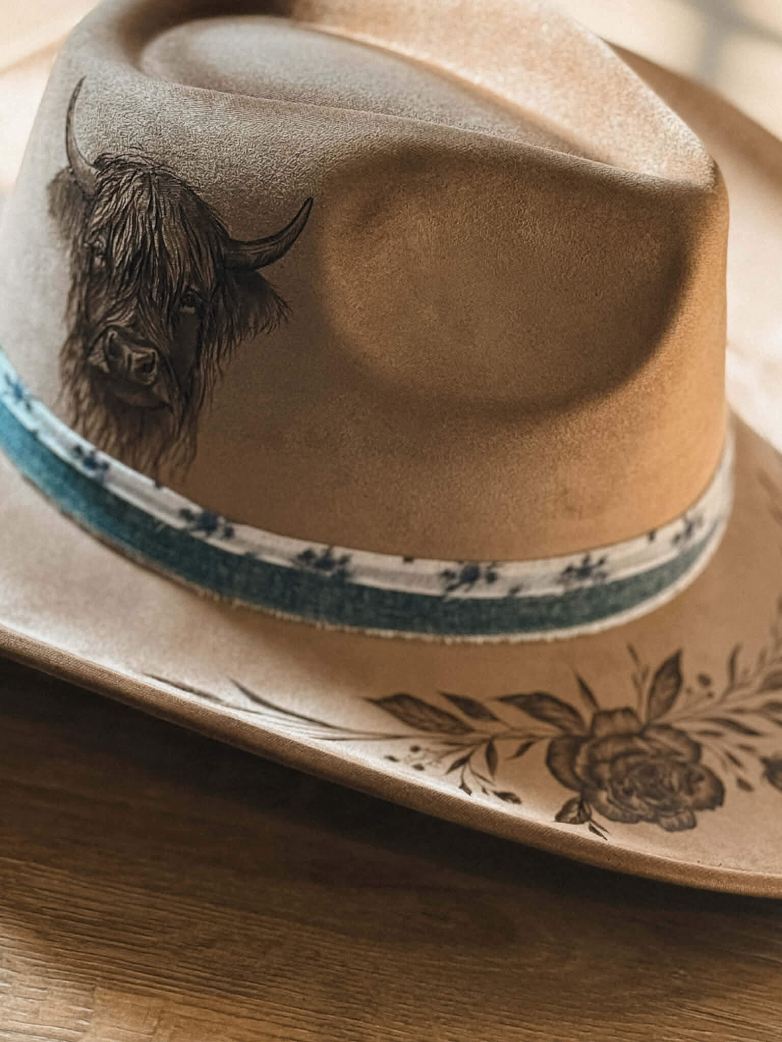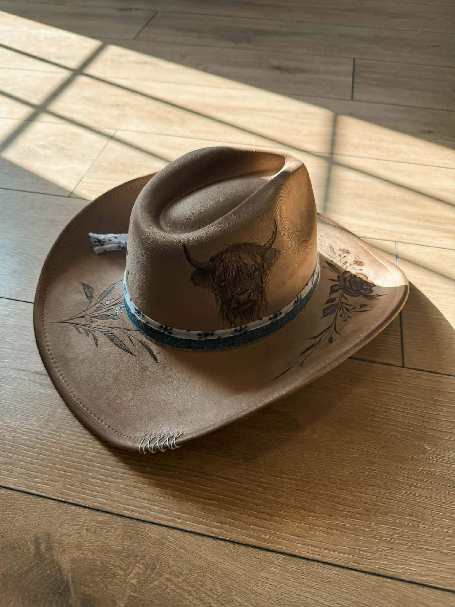 Un chapeau tout en finesse qui représente bien l’amour des fleurs, des champs et des vaches Highland.