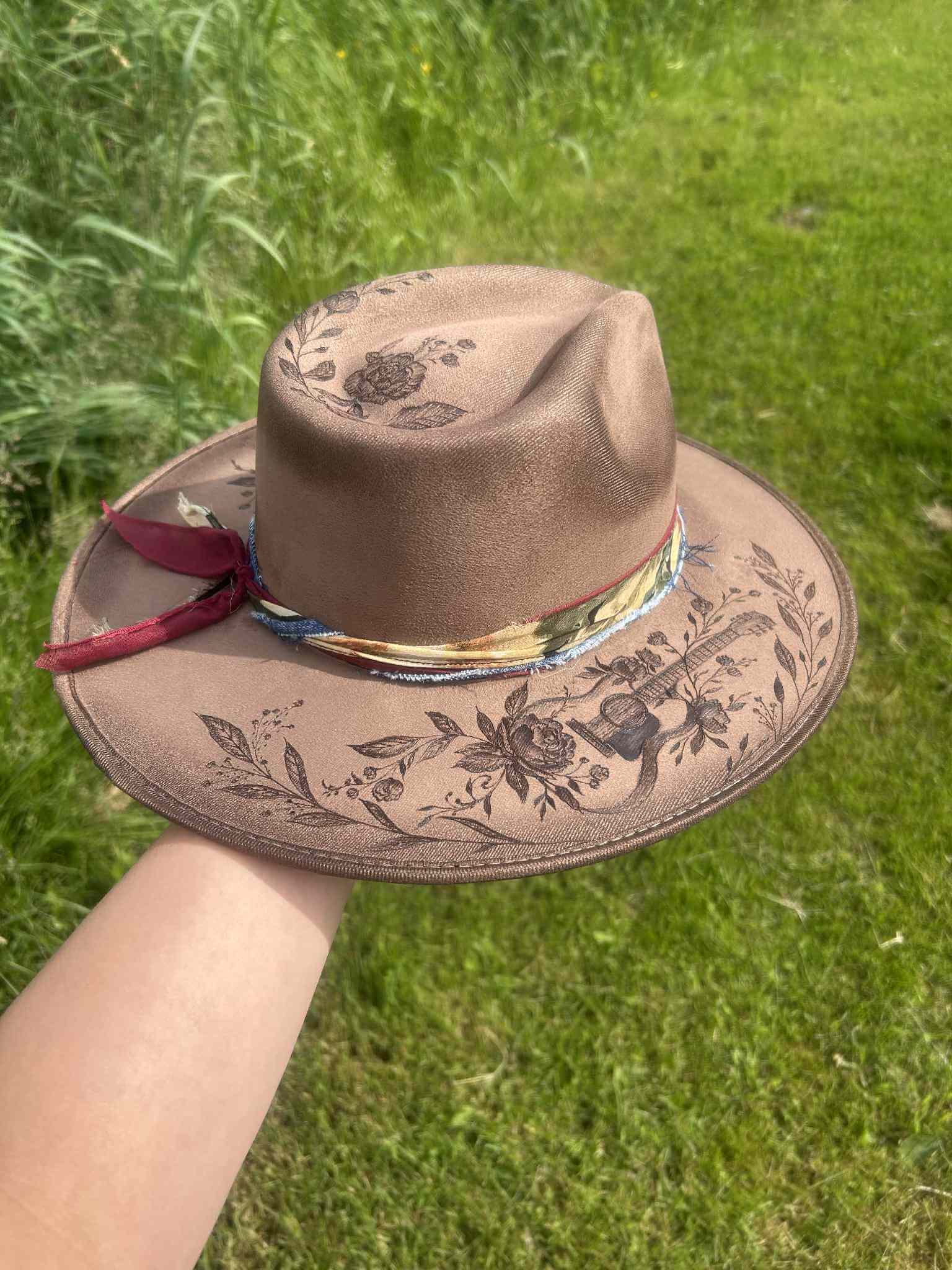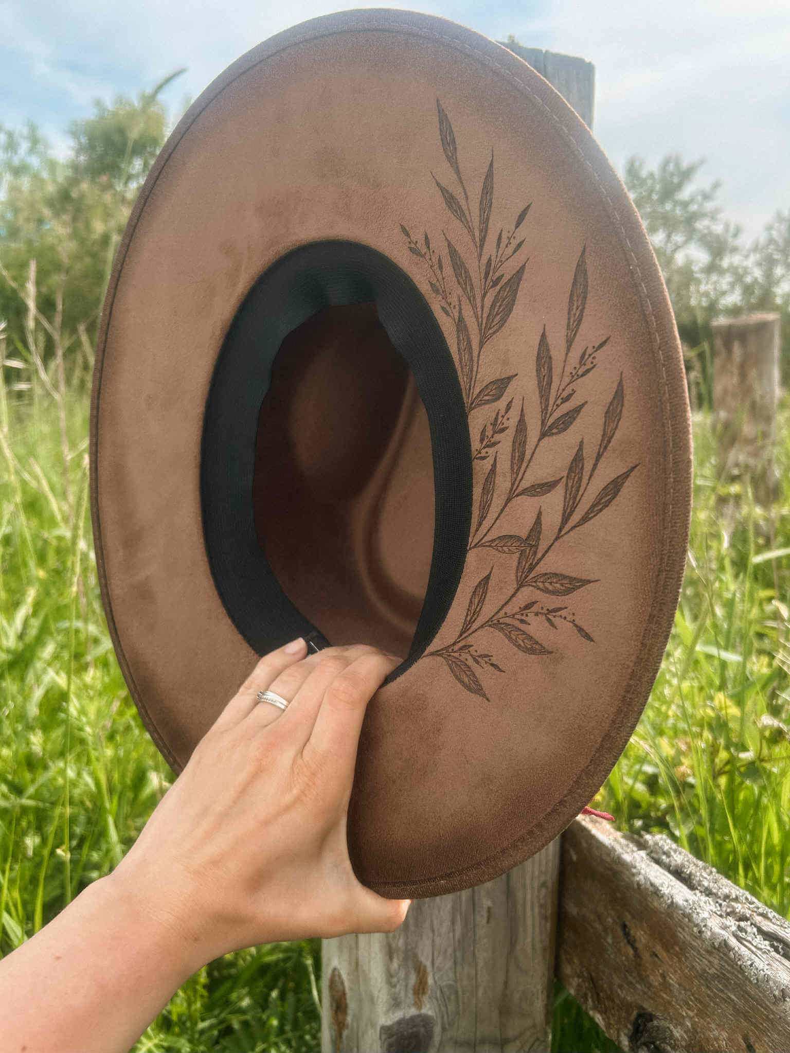 Chapeau pyrogravé « Strings & Peonies »