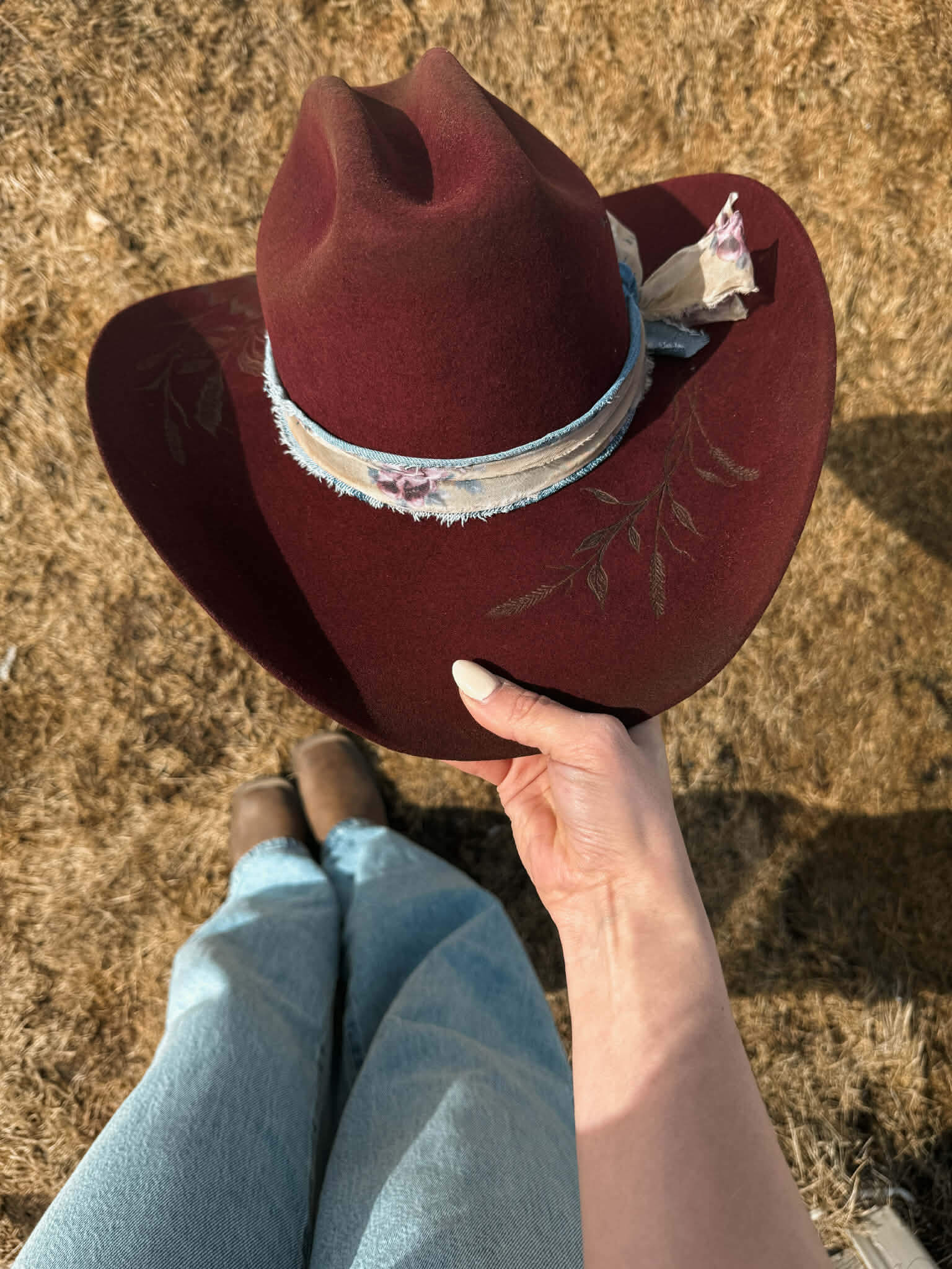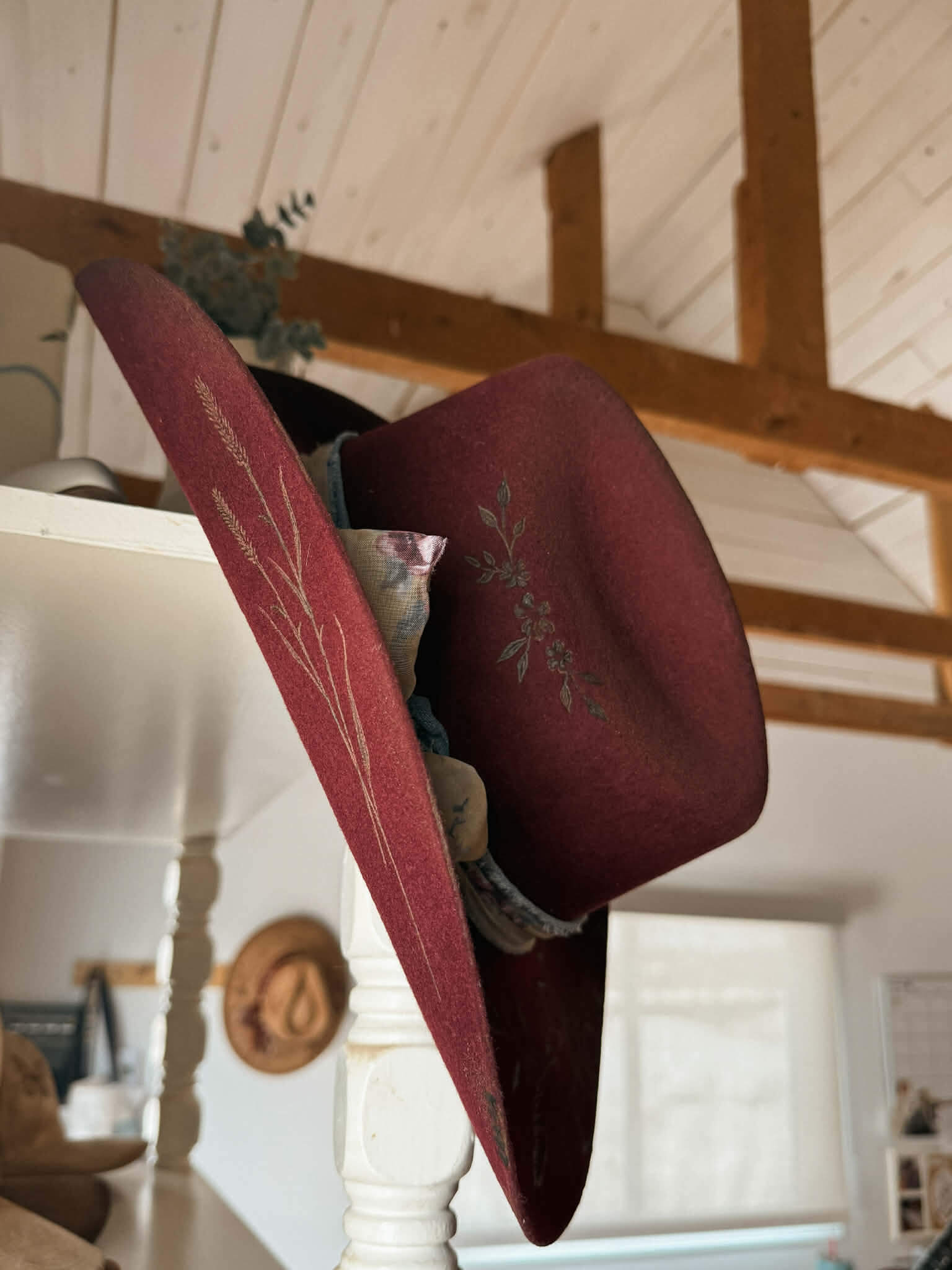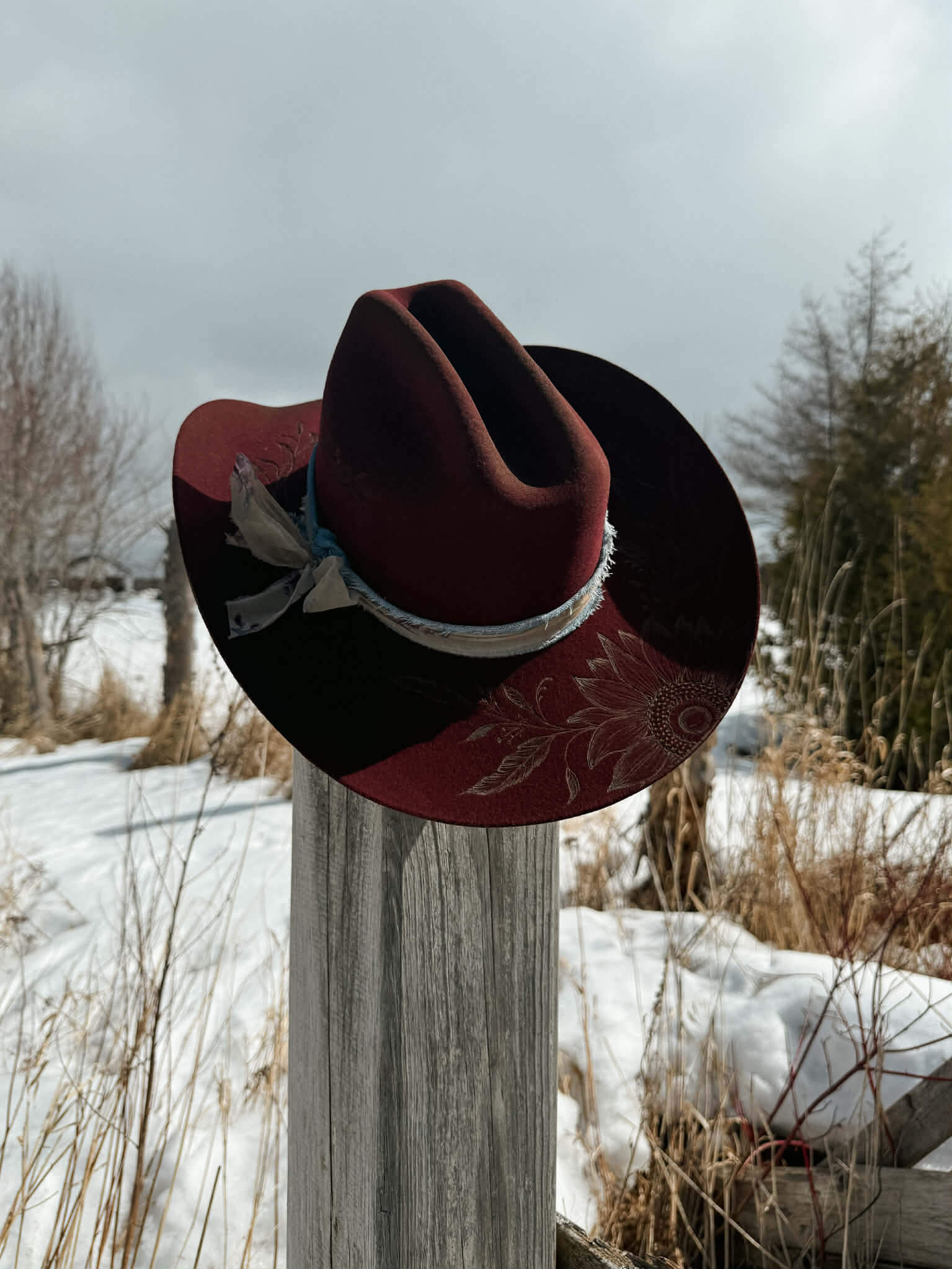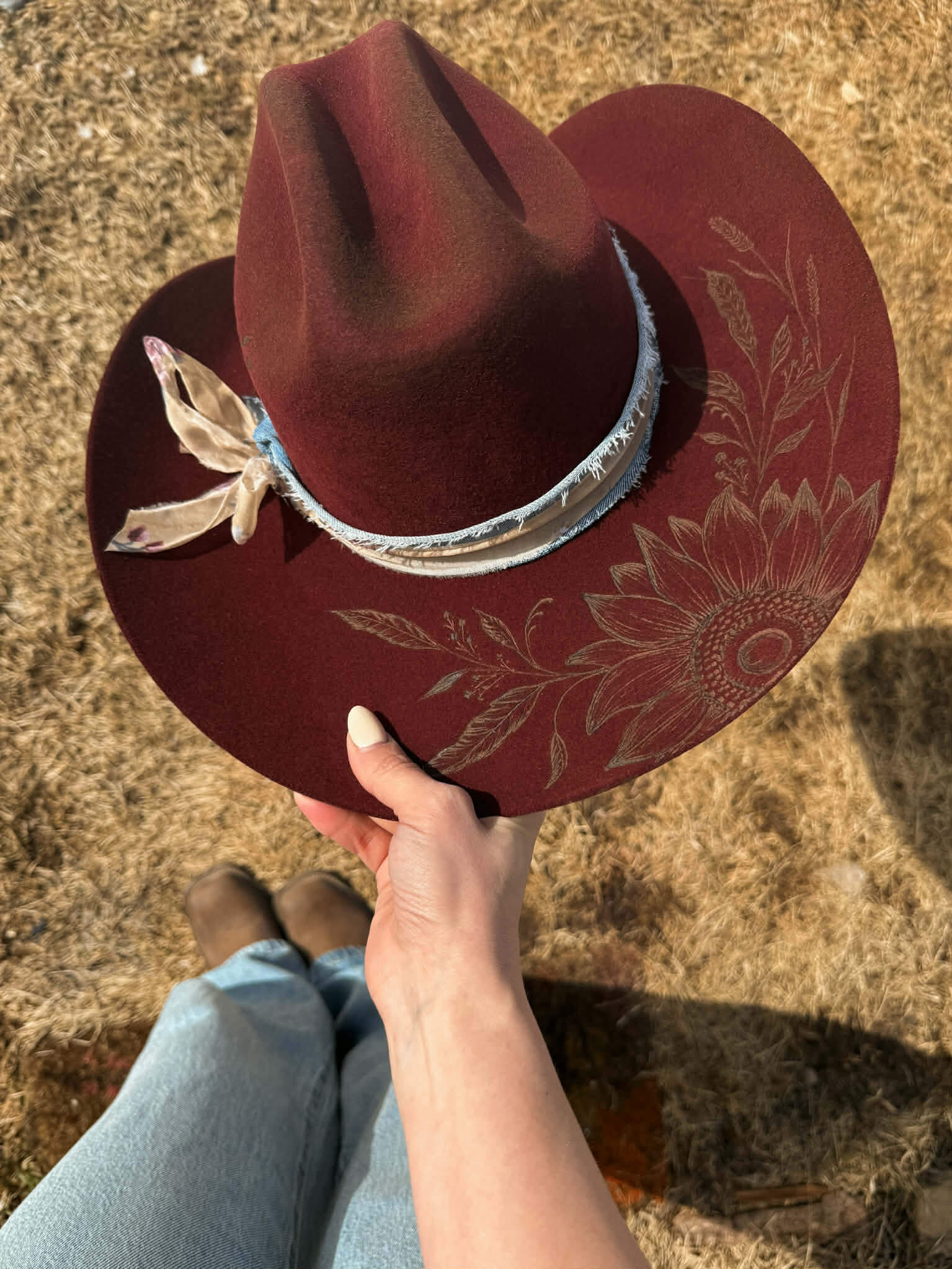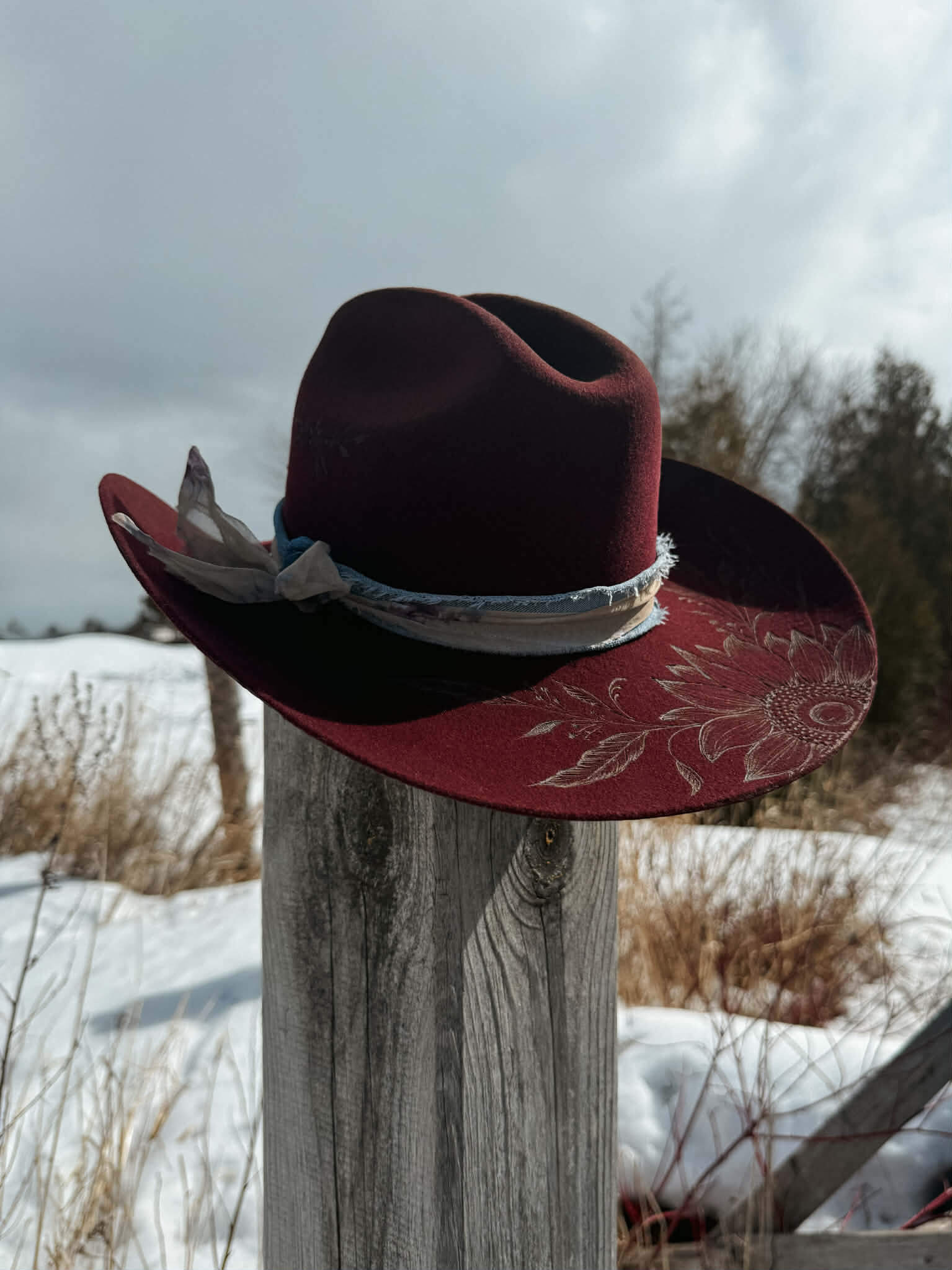 « Velvet Sunflower » est un chapeau en laine cachemire de couleur rouge bourgogne. La couleur riche et profonde lui donne automatiquement un look unique. De magnifiques tournesols et des tiges de blé viennent compléter à merveille cette création.