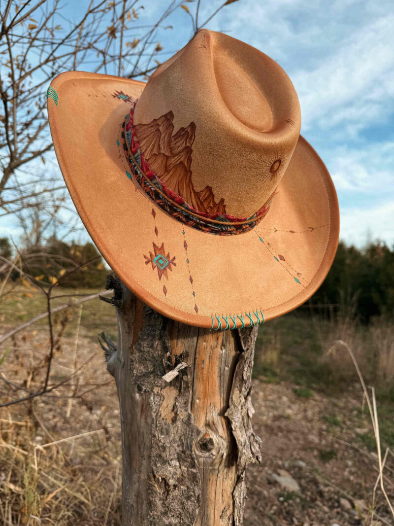 Western Soul rappelle la chaleur du désert et l’esprit « western ». Les teintes turquoises ajoutent quelque chose d’unique au chapeau. Modèle unique créé à main levée par K.S Arts Visuels.