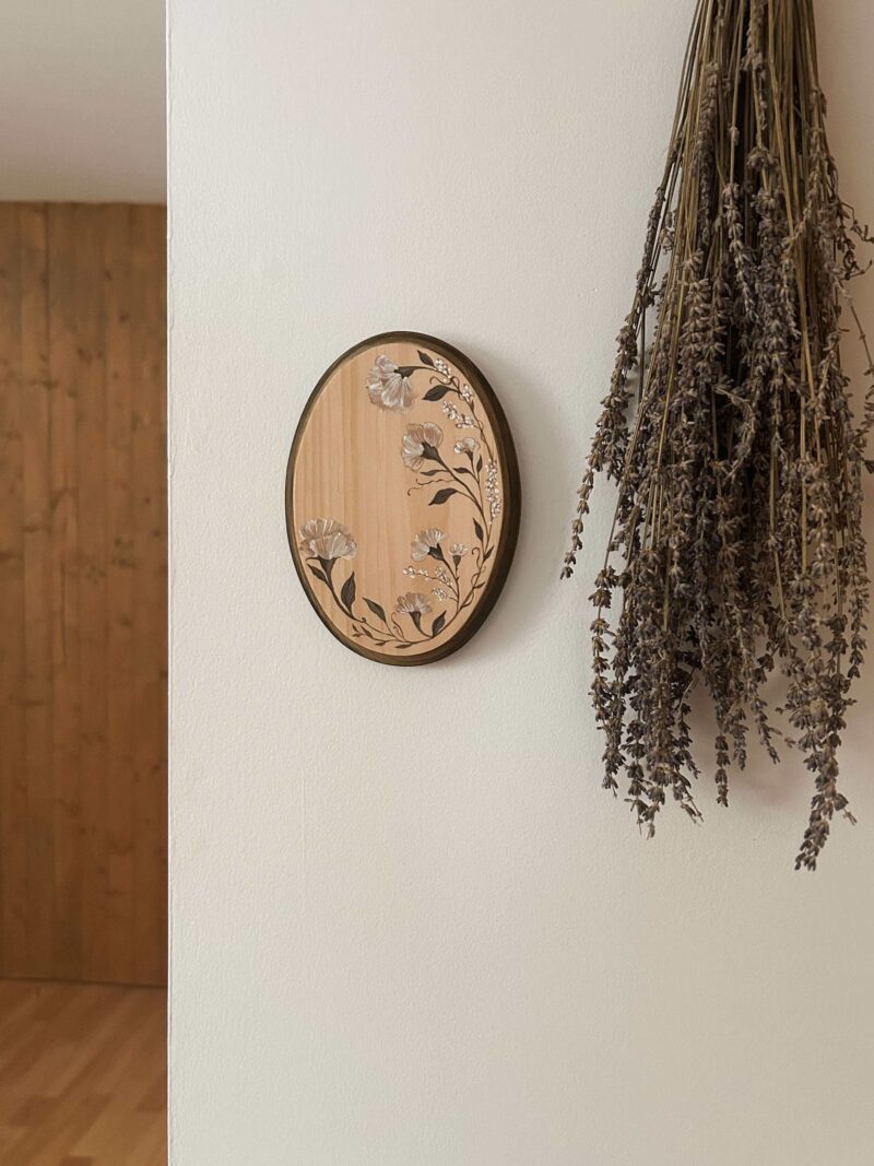 Douce décoration florale peinte à la main sur un oval de bois.