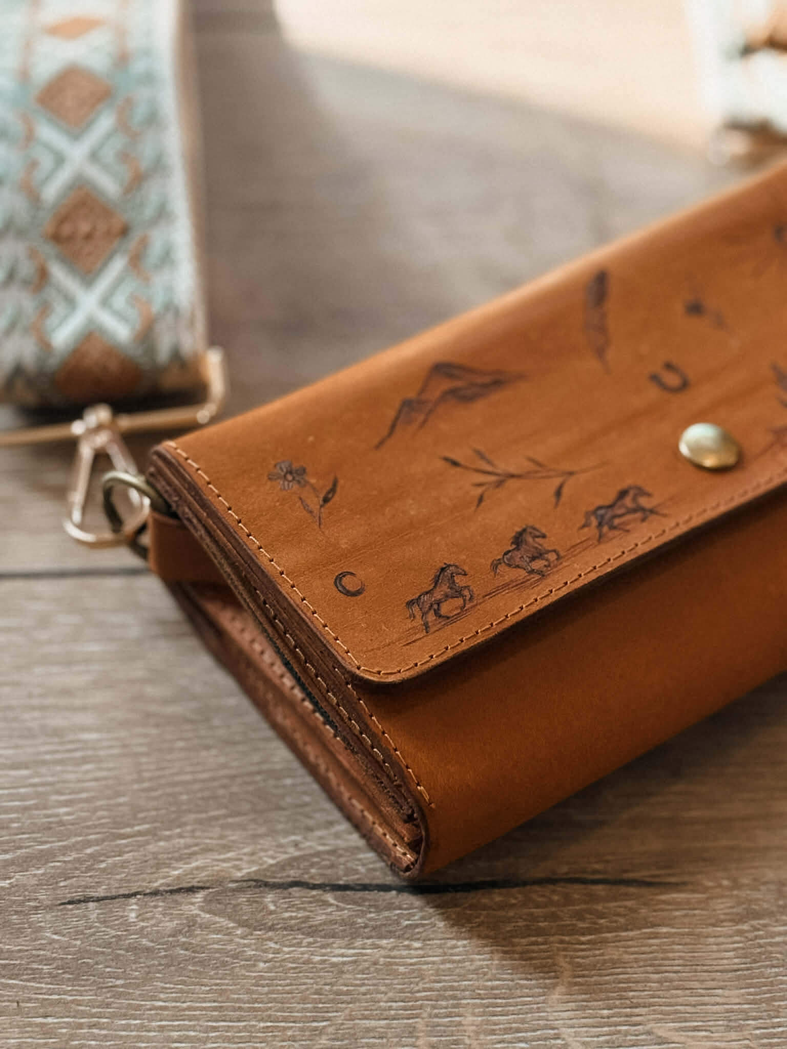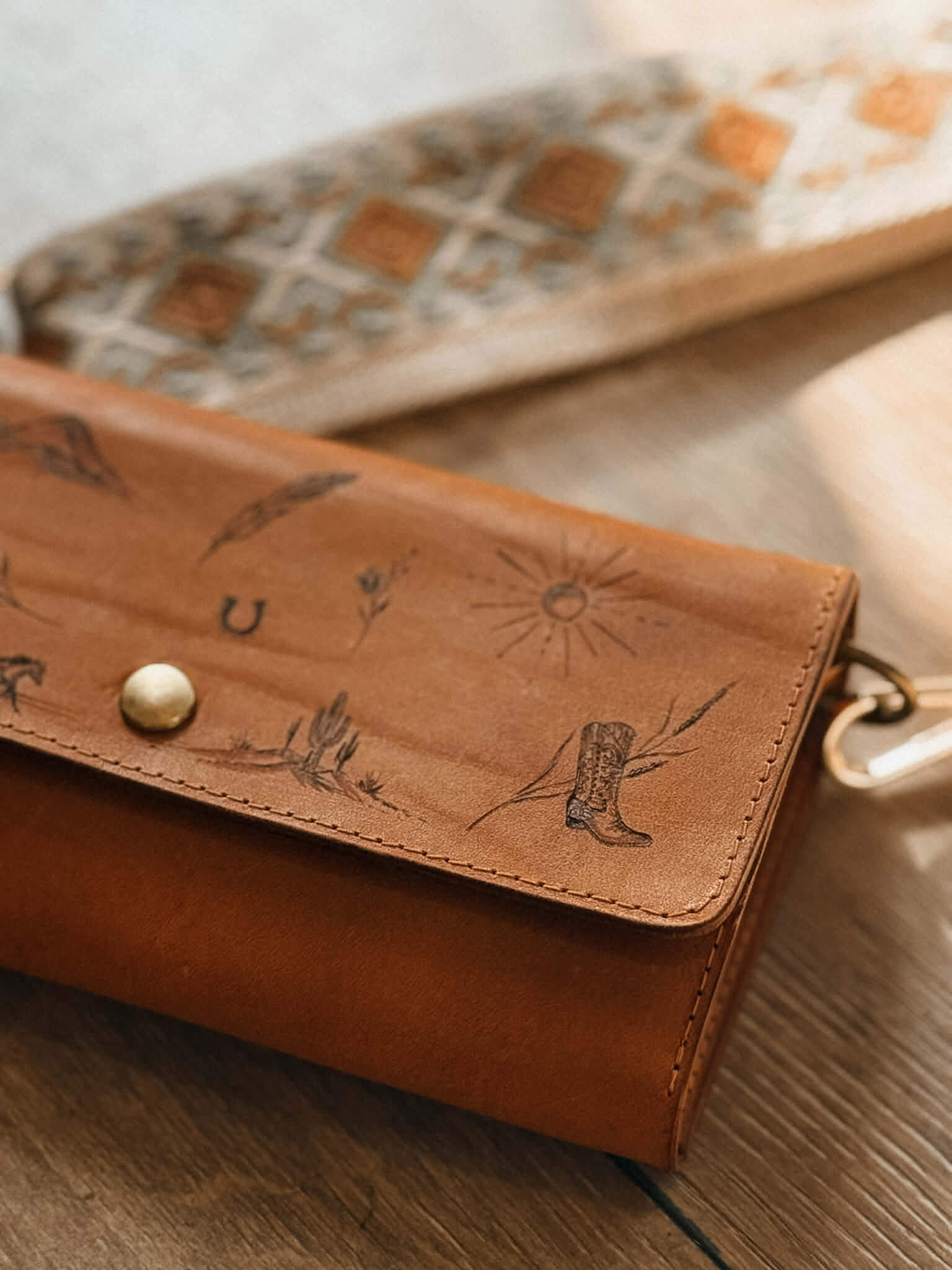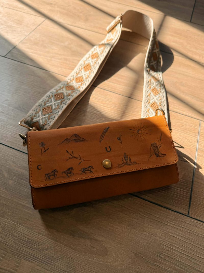 Magnifique sac à main en cuir pyrogravé délicatement pour un look unique et élégant. La pyrogravure est symbolique et le style « patchwork » vous permet de toujours avoir un petit look western. Impossible de retrouver un sac comme celui-ci…